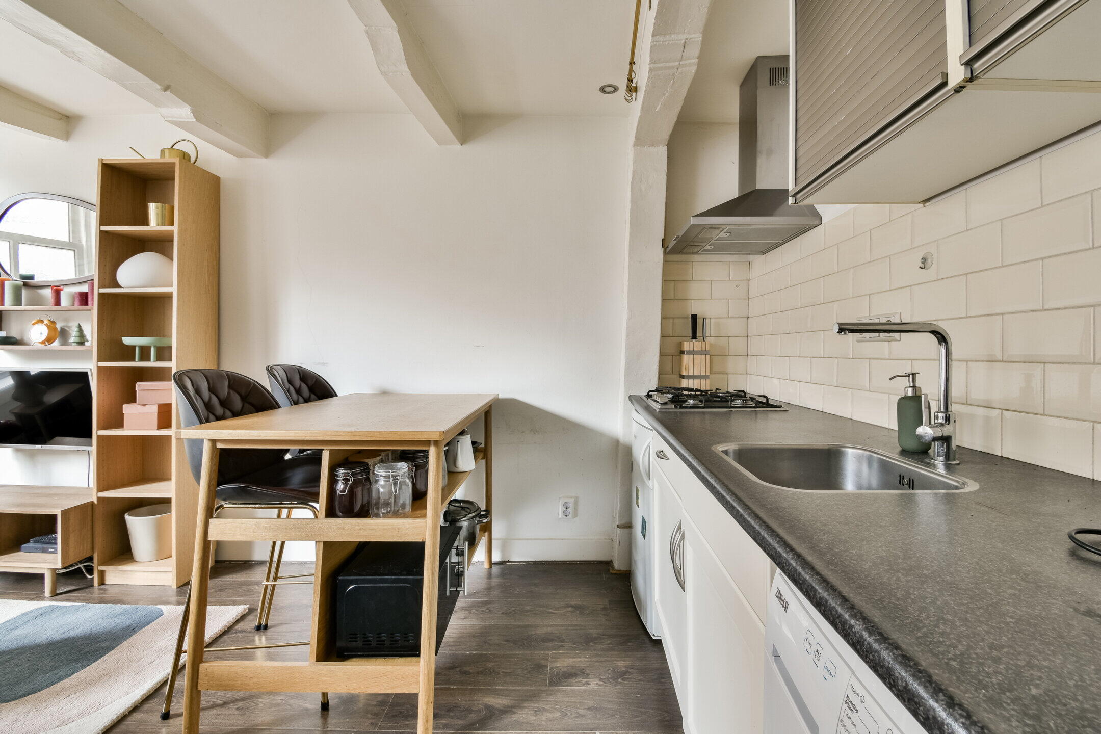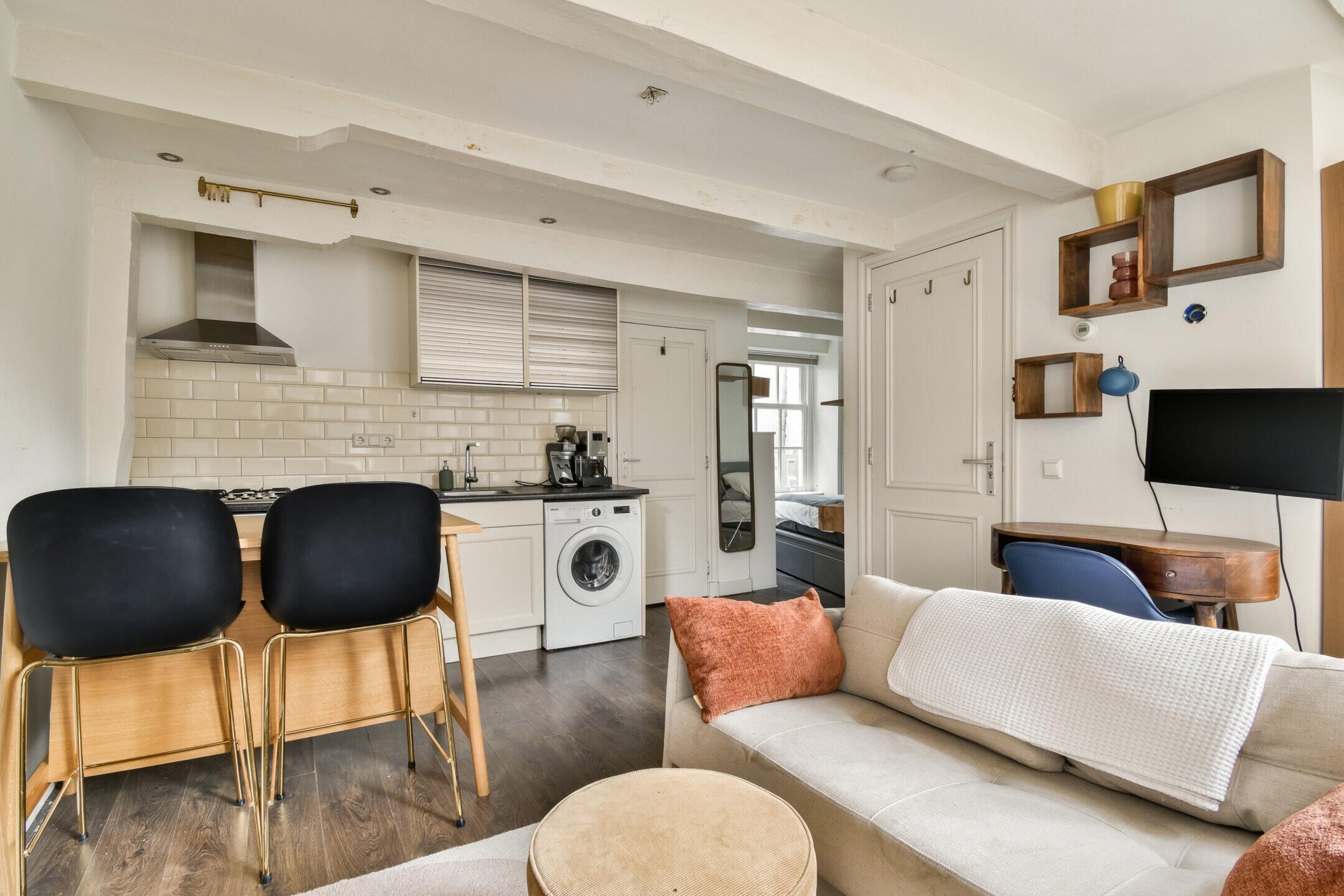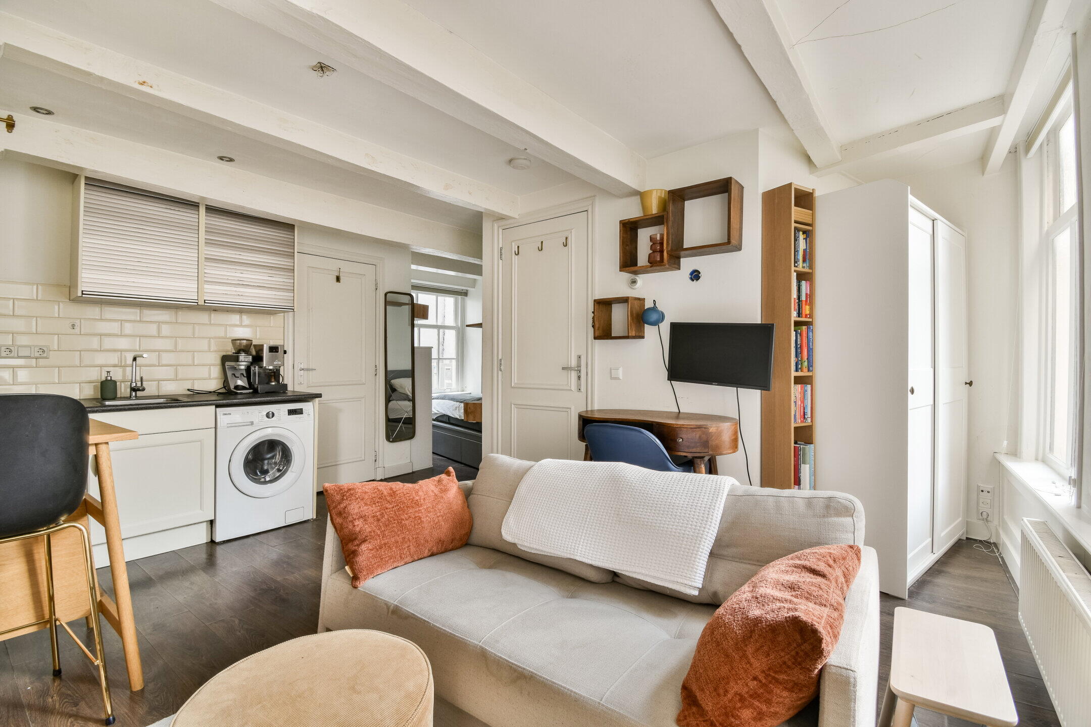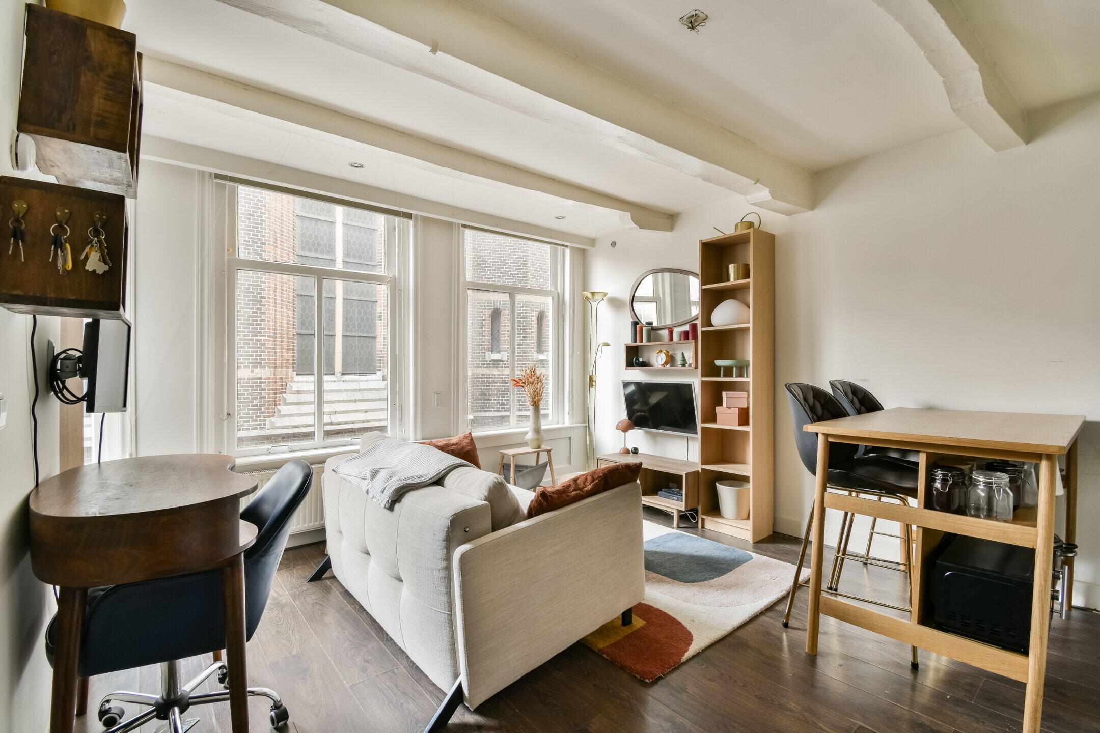 The living room has three large windows at the front, providing plenty of natural light and a lively view of the street. The open bedroom connects seamlessly to the living area and can be relatively easily separated for those who prefer a more closed layout. The characteristic beams and luxurious recessed spotlights complete the look and complement the space.