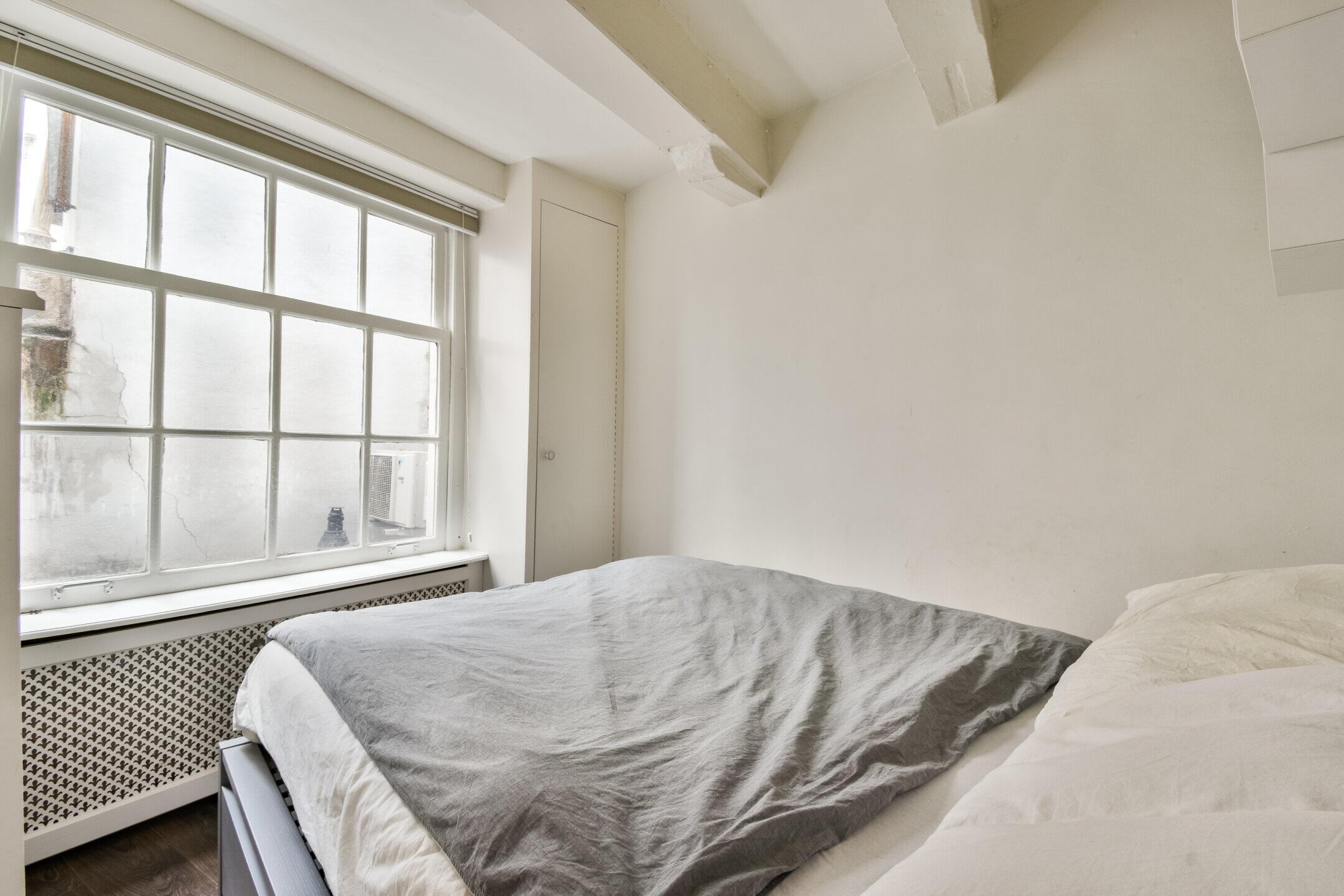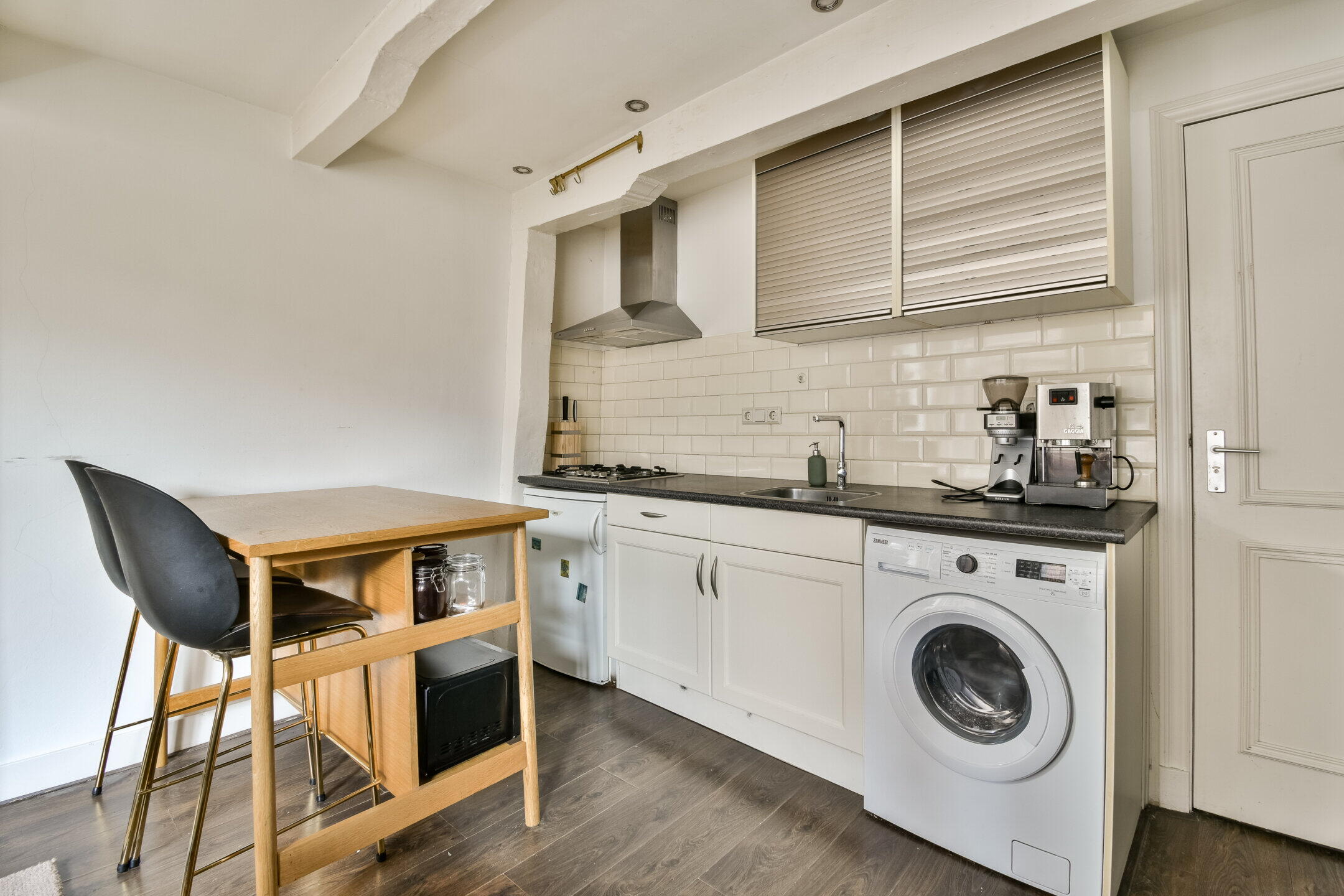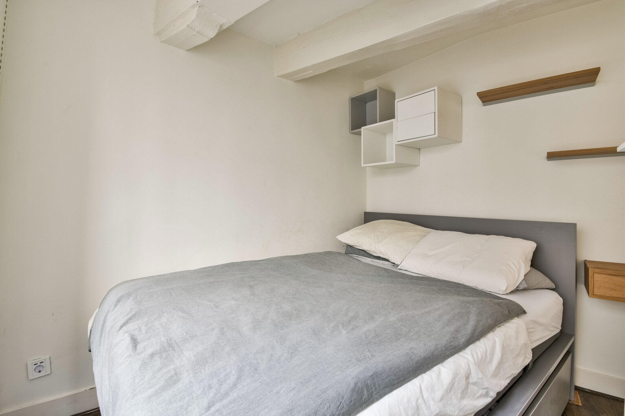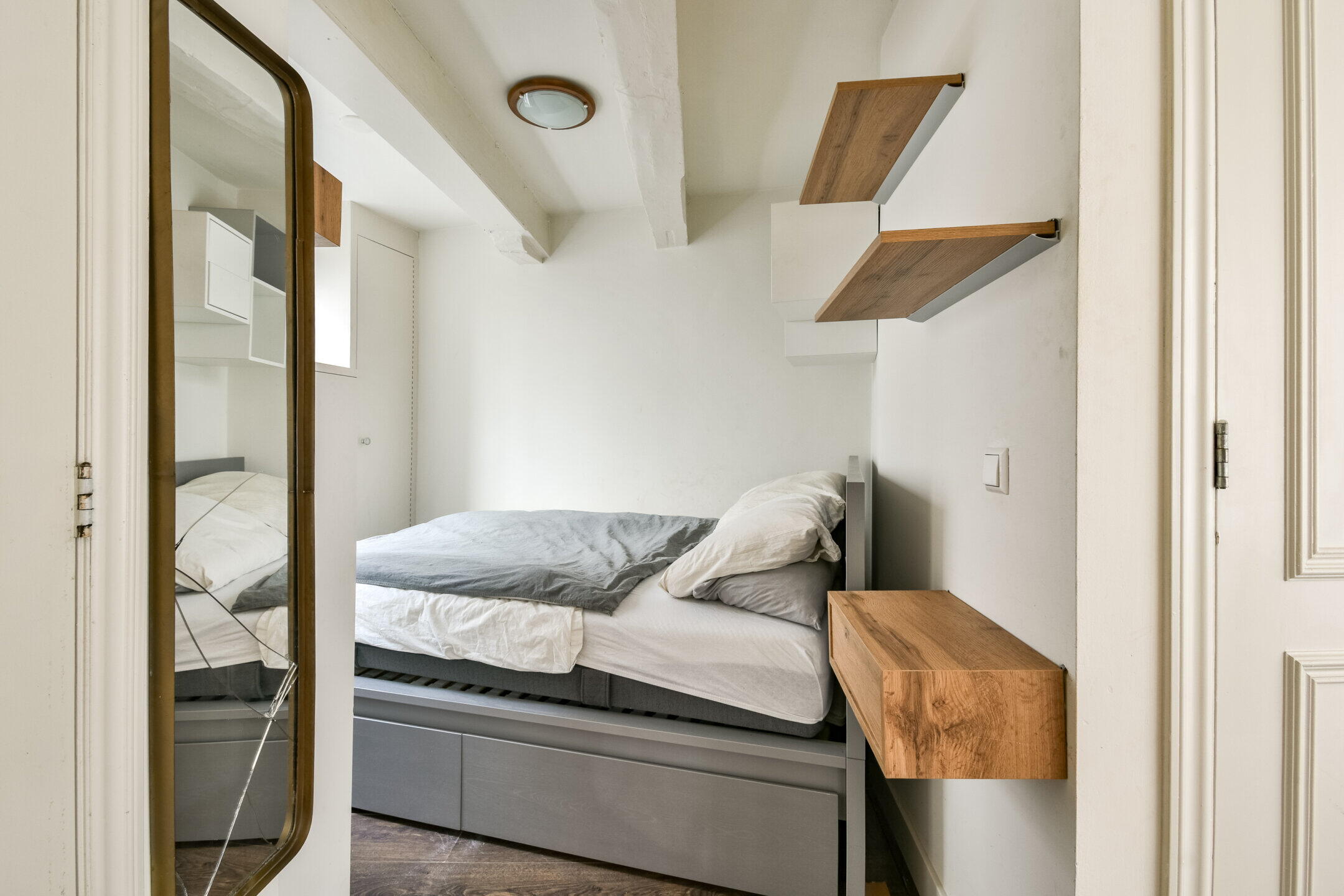 The living room has three large windows at the front, providing plenty of natural light and a lively view of the street. The open bedroom connects seamlessly to the living area and can be relatively easily separated for those who prefer a more closed layout. The characteristic beams and luxurious recessed spotlights complete the look and complement the space.