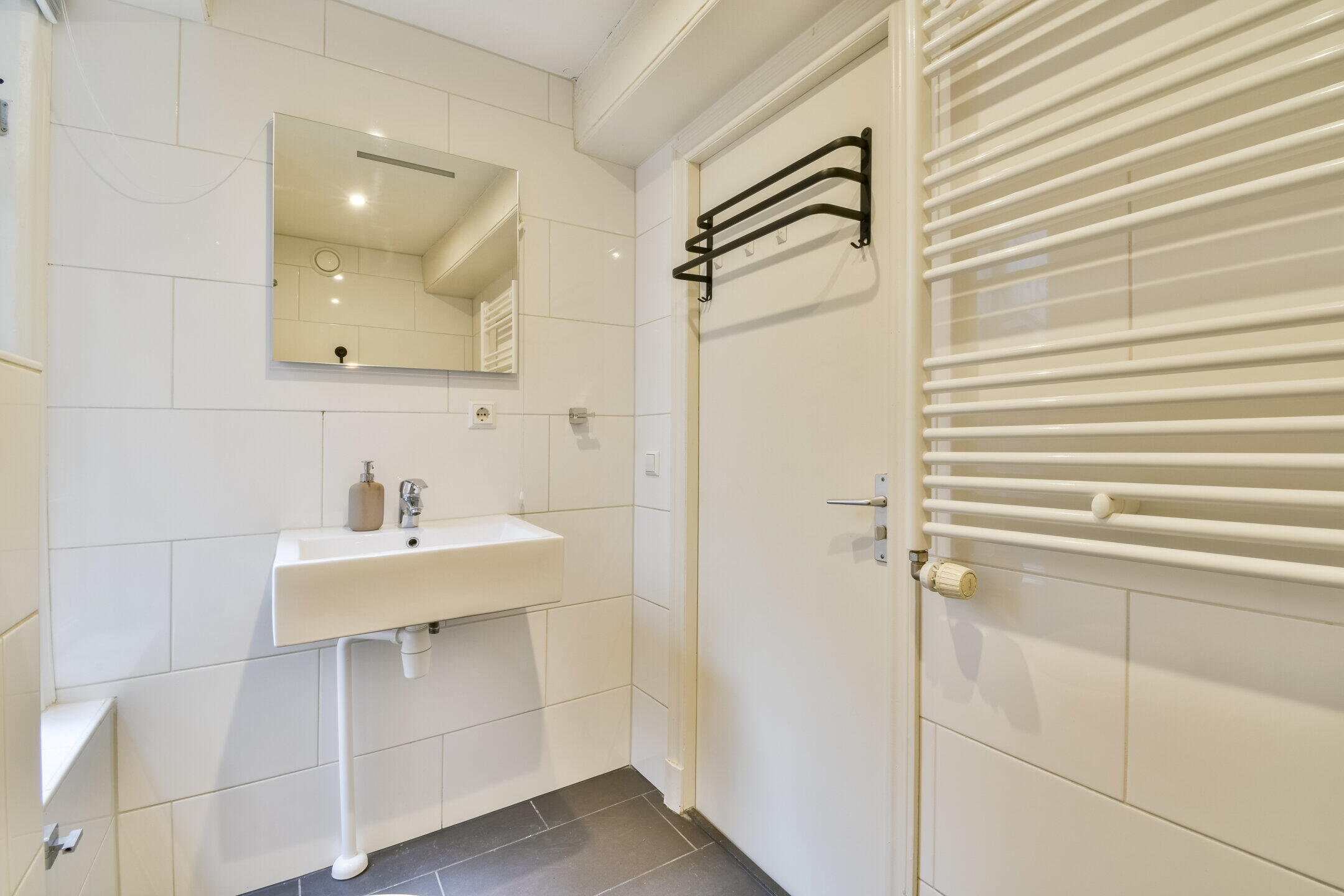 De strakke badkamer is voorzien van een douche, wastafel en toilet.